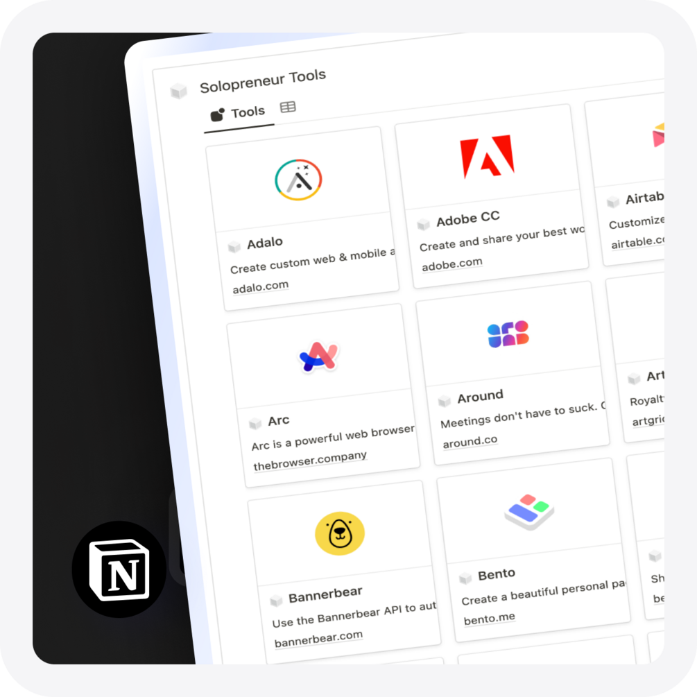 Solopreneur Tools 🛠️ You will get instant access to a notion template with the curated list of All the Tools with their respective links + descriptions.